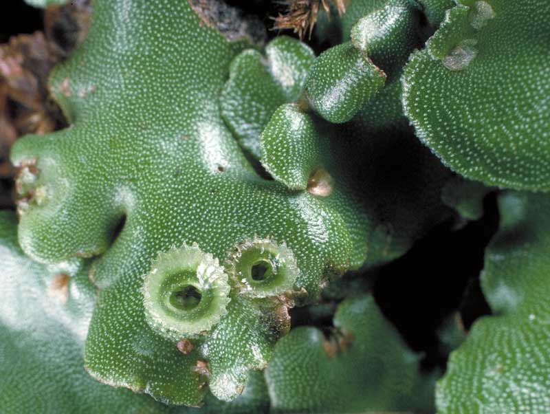 Marchantia sp. - with two circular gemma cups and numerous whitish air pores