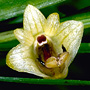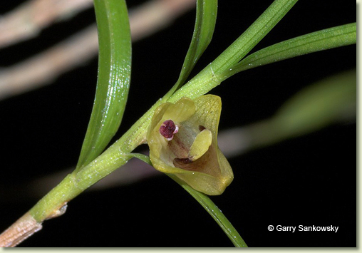 Epiphytic or lithophytic herb forming small grass-like clumps. Stems crowded, semi-erect to arching, very thin, 10-30 cm x 0.1 cm, wiry. Leaves scattered along stem, erect, distichous, alternate, sessile, bases sheathing stem and enclosing node; lamina linear, 3-6 cm x 0.4 cm, dark green, apex deeply emarginate. Inflorescence single-flowered, emerging opposite a leaf. Flower solitary, resupinate, porrect, cupped, 6-7 mm x 7-8 mm, cream with purple and yellow labellum, shiny. Sepals and petals widely spreading. Dorsal sepal obliquely erect, ovate, 3-3.5 mm x 2 mm. Lateral sepals broadly triangular, 3.5-4 mm x 4.5 mm, bases fused to column foot. Petals porrect, ovate, 3 mm x 1.5 mm. Labellum porrect, 5 mm x 2.5 mm, 3-lobed; lateral lobes small, rounded; midlobe separated by a constriction, with 2 obscure ridges. Column 1 mm long. Column foot slightly curved, 4 mm long, at right-angles to the column. Capsule pendulous, dehiscent.
