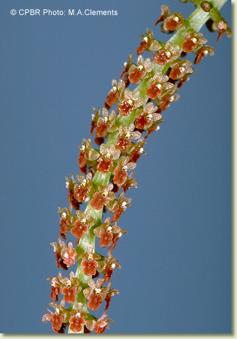 Epiphytic or lithophytic herb forming large, erect to porrect clumps. Leaves 4-6, scattered along stem, erect, distichous, alternate, sessile, in fan-like array, bases sheathing stem, imbricate; lamina broadly ensiform, falcate, 8-15 cm x 1.5-2 cm, bright green to yellowish green, fleshy, apex acute. Inflorescence a terminal raceme, arching, 100-200 mm long, base with few small bracts; pedicels 2.5 mm long, including ovary. Flowers numerous, in whorls of 6-8, non-resupinate, porrect, 2.3 mm x 1.5 mm, whitish to yellowish. Sepals and petals usually reflexed against the ovary. Dorsal sepal ovate to deltate, 1.2 mm x 1 mm, apex obtuse. Lateral sepal free, ovate, 1.2 mm x 0.8 mm, irregular, apex apiculate. Petals ovate to lanceolate, 1.2 mm x 0.5 mm, margins irregularly toothed. Labellum broadly triangular, 1.3 mm x 1.5 mm, obscurely 3-lobed, margins densely fringed, apex emarginate. Column porrect from end of ovary, 0.7 mm long. Column foot absent. Capsules porrect, dehiscent.
