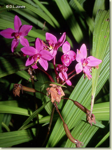 Terrestrial herb forming tall grass-like clumps. Pseudobulbs crowded, erect, ovoid, 3-5 cm x 3-5 cm, shallowly subterranean, fibrous. Leaves 4-7, erect, whorled, petioles 6-12 cm long; lamina lanceolate, 80-180 cm x 3-5 cm, dark green to yellowish, pleated, apex acuminate. Inflorescence an axillary raceme, 30-120 mm long, from base of pseudobulb; pedicels 15-30 mm long. Flowers 6-30, resupinate, porrect to nodding, star-shaped, 20-30 mm x 20-30 mm, mauve to purple, rarely white, sometimes hardly opening. Dorsal sepal erect to incurved, obovate, 12-20 mm x 5-7 mm. Lateral sepals free, divergent, obovate, 12-20 mm x 5-7 mm. Petals widely spreading, broadly ovate, 10-18 mm x 8-9 mm. Labellum 9-12 mm x 9-10 mm, projected forward, base hairy, 3-lobed; lateral lobes narrow, erect; midlobe spathulate, base with 2 yellow, sparsely hairy calli, often fused. Column 6-9 mm long. Column foot short. Capsules porrect to pendulous, hairy, dehiscent.