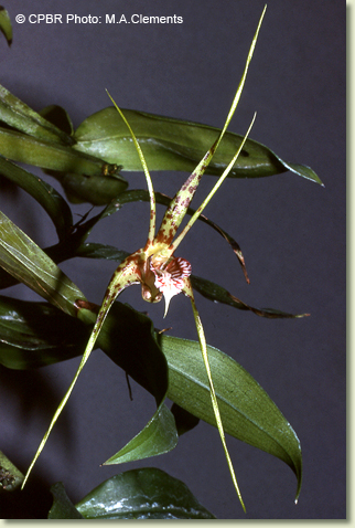 Epiphytic or lithophytic herb forming pendulous clumps. Pseudobulbs pendulous, 30-60 cm x 0.6-0.9 cm wide, narrow and wiry in basal half, becoming broader and quadrangled along length, narrowing at apex, greenish brown. Leaves 2-5, prostrate, apical, ovate, 5-9 cm x 2-4 cm, dark green, thin, leathery, apex acute. Inflorescence an axillary raceme, 10-35 mm long, from upper nodes of pseudobulb, filiform. Flowers 1-4, resupinate, porrect, 70-120 mm x 60-80 mm, greenish yellow with prominent red blotches, labellum white with red or purplish lines. Sepals narrowly triangular, tapered, apices filiform. Dorsal sepal erect, 40-70 mm x 3-5 mm. Lateral sepals divergent or sometimes crossed, falcate near base, 30-70 mm x 7-10 mm, occasionally twisted, bases fused to column foot. Petals divergent, erect, linear, 25-40 mm x 1.5-2 mm. Labellum projected forward, recurved, 11-15 mm x 17-20 mm, 3-lobed; lateral lobes erect; midlobe narrow, shortly hairy, sharply pointed, with 3 prominent parallel ridges. Column 4-5 mm long. Column foot slightly curved, 8-10 mm long, at right-angles to column. Capsules pendulous, dehiscent.