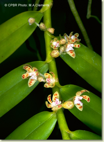 Epiphytic or lithophytic herb forming coarse straggling clumps. Plants often consisting of a single erect to semi-pendulous growth. Roots thick, cord-like. Stems erect to pendulous, 10-50 cm long, thick, flattened, sparsely branched from the base. Leaves scattered along stem, erect to pendulous, often drooping, distichous, alternate, sessile, bases sheathing stem; lamina lanceolate, 7-12 cm x 2-2.5 cm, dark green to yellowish green, thick, leathery, glossy, apex unequally emarginate. Inflorescence an axillary raceme, emerging opposite a leaf; peduncle very short; pedicels 5-10 mm long. Flowers 2-6, in tight clusters, resupinate, erect to porrect, 10-12 mm x 10-12 mm, creamy yellow with red-brown blotches. Sepals and petals widely spreading, thin-textured. Dorsal sepal erect, oblong, 6.5 mm x 2 mm, apex incurved, obtuse. Lateral sepals free, oblong, 7 mm x 3 mm, with rounded basal lobe, bases fused to column foot. Petals spathulate, 6 mm x 2 mm. Labellum projected forwards, 5 mm x 2.5 mm, 3-lobed; lateral lobes erect, fleshy, joined to column base; midlobe 2.5 mm long, fleshy, hairy, with spur 1.5 mm long. Column 3 mm long. Column foot absent. Capsules porrect, dehiscent.