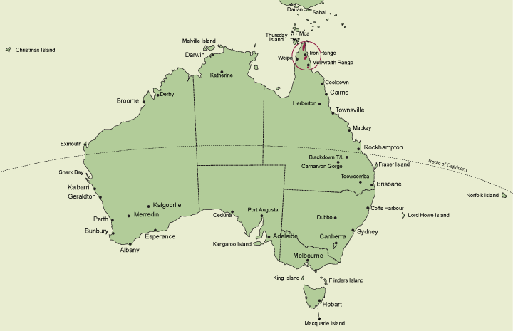 Currently monospecific with the single species, Rhinerrhizopsis moorei, occurring in eastern Australia and distributed between the Iron Range (about 17º16' S) and the McIlwraith Range (about 32º56' S) on Cape York Peninsula in northeastern Queensland. State occurrence: Queensland.
