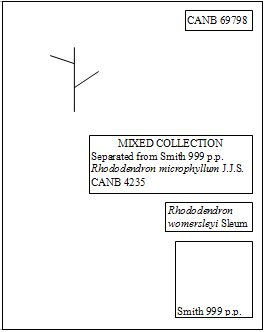 Sometimes there may be more than one taxon mounted on the one sheet, e.g. Fig. 1. Since a mounted sheet should represent one taxon only, the specimens should be separated and made into two separate herbarium sheets. Please consult a supervisor before attempting this.