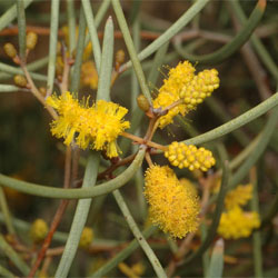 A. aneura grows up to 10 meters as single-stemmed tree in higher rainfall areas, but is a 2 to 3 meter high shrub in dry situations or on very shallow soils. Phyllodes (a phyllode is a leaf whose blade is much reduced or absent, and whose petiole and rachis have assumed the functions of the whole leaf). are needle-like and 3 to 11 centimeters long, with very fine hairs giving the foliage an attractive silvery-grey appearance. Small bright-yellow flowers form spikes 1.5 to 2 centimeters long. Flowering may occur at any time of the year following suitable rains, however the principle flowering time is between March and October, with a peak in May. Thin, flat membranous pods, 2 to 5 centimeters long contain edible dark brown seeds.