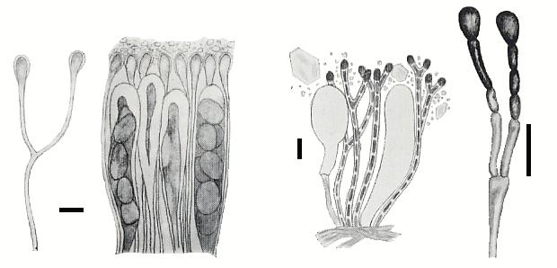 Filson also showed microscopic detail. For example, in the following series of four figures, the two on the left illustrate some features of Lecanora expectans. The first shows a forked paraphysis and to its right a depiction of part of an apothecium in which you can see several asci in different stages of development. Paraphyses (the plural of paraphysis) are sterile hyphal ends that are present in the apothecium amongst the asci. They vary greatly in shape and colour between species, sometimes being no more than un-modified hyphae while at other times they may be forked or have swollen ends. They may be uncoloured or pigmented, smooth or encrusted, septate or with no internal divisions.