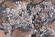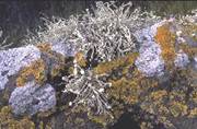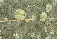 Mixed lichens on concrete showing an inhibition zone in the drip-line below a handrail |