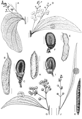 Caption: A-C . Acacia dunnii . A , flowering branchlet; B , pod; C , seed (A , B.Maslin 5137, PERTH; B-C , K.Kenneally 4277, PERTH). D-F . Acacia tolmerensis . D , flowering branchlet; E , pod; F , seed (D , I.Cowie 1434 & C.Dunlop, PERTH; E-F , I.Cowie 1844, DNA). G-I . Acacia convallium . G , flowering branchlet; H , pod; I , seed (G , J.Russell-Smith 5224 & D.Lucas, DNA; H-I , B.Thomson 91, DNA). J-K . Acacia kenneallyi . J , flowering branchlet; K , pod (J , K.Kenneally 10036, PERTH; K , P.Wilson 10901, PERTH).Illustrators: M.Pieroni.