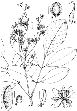 Caption: Storckiella australiensis . A , flowering twig; B , flower bud showing imbricate sepals; C , open flower showing reflexed sepals and erect stamens; D , stamen showing short filament and anther dehiscing apically; E , gynoecium (B.Hyland 6357, QRS); F , pod; G , seed (B.Hyland 6603, QRS).Illustrators: A.Barley (nee Podwyszynski).