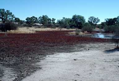 (brown 'dead' plants with withered sporocarps at their base, in receding lake channel)
